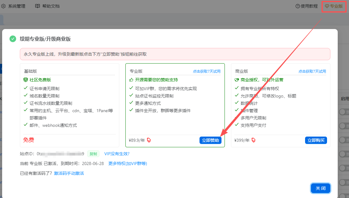 - 方式2. 如果旧站点数据丢失,您也可以部署一个新站点,然后在系统管理-->账号绑定页面,转移VIP即可