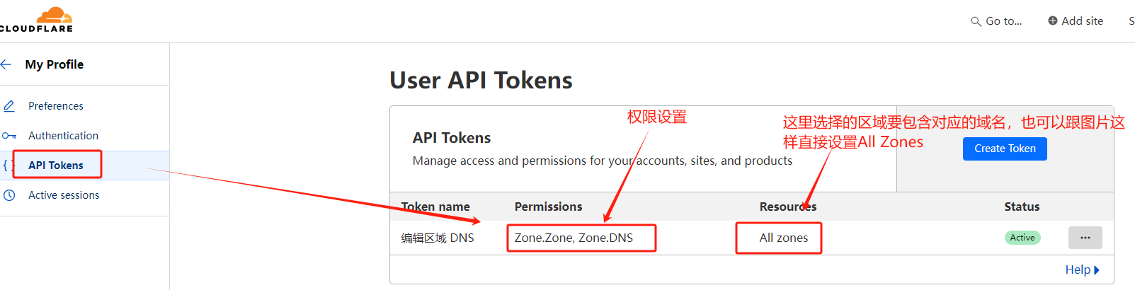 权限包括:Zone.Zone.edit, Zone.DNS.edit